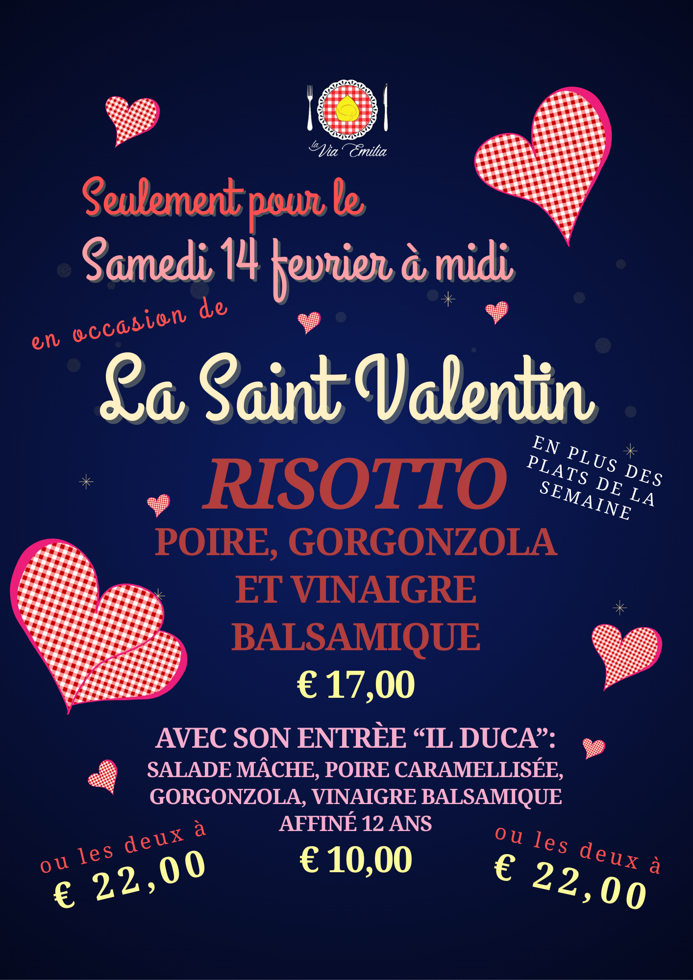 Avec nos produits fars, toujours présents dans la carte, nous proposons chaque semaine des plats différents sélectionnés parmi tous ceux qui font partie de notre Tradition.